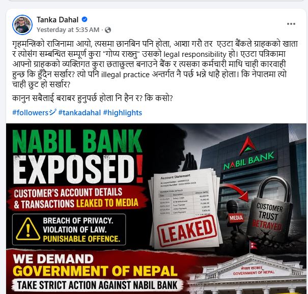 केही दिनयता नबिल बैंकले ग्राहकहरुको विवरण मिडियालाई दिएको भन्ने भ्रम छरियो । टंक दाहाल नामक क्रियटरले कान्तिपुरको समाचारलाई लिएर फेसबुकमा लेख्दै नबिलले खाता र कारोबारको विवरण लिक गराएको भन्ने जस्ता विषय उल्लेख गरेका छन् ।
