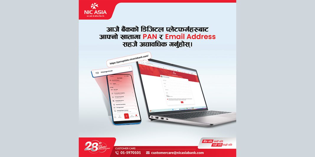 एनआईसी एशिया बैंकले आफ्ना ग्राहकहरूलाई आफ्नो खातामा स्थायी लेखा नम्बर (प्यान) र ईमेल ठेगाना अद्यावधिक गर्न अनुरोध गरेको छ ।