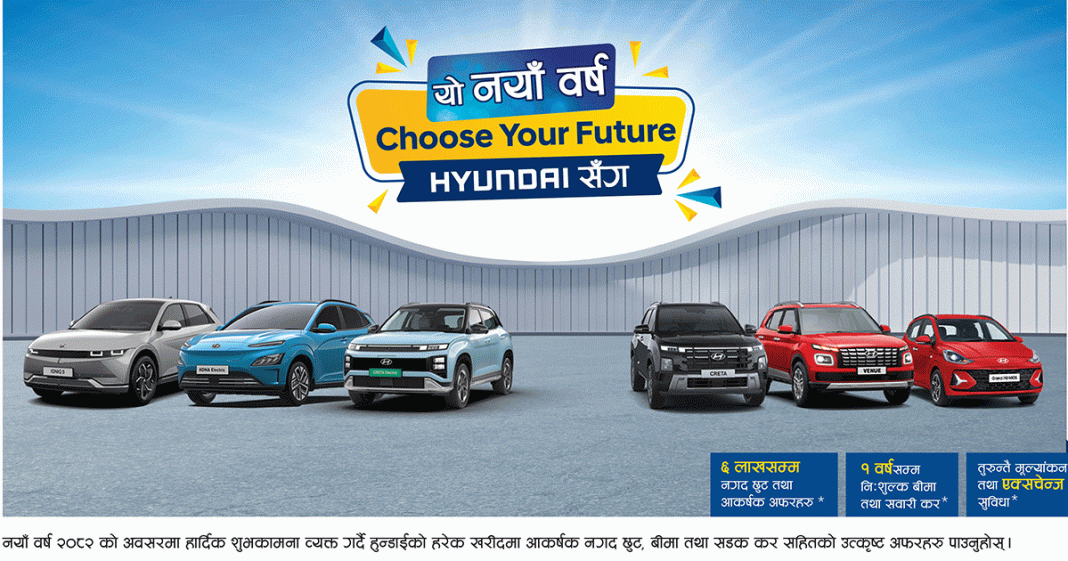 यस अन्तर्गत कम्पनीले ग्राहकहरुको यात्रा खास बनाउन हुन्डाईले नगद छुटको आकर्षक अफर ल्याएको जनाएको छ । कम्पनीका अनुसार “यो नयाँ बर्ष, CHOOSE YOUR FUTURE हुन्डाई सँग” अन्तर्गत ग्राहकहरुले हुन्डाई गाडीको खरीदमा आकर्षक रु ६ लाख सम्म नगद छुट प्राप्त गर्न सक्ने छन् । हालै सार्वजनिक गरिएको “CHOOSE YOUR FUTURE ” को थिमसहित, क्रेटा EV र क्रेटा ICE (मेड इन नेपाल) लाई यो अफरले अझै उत्साहजनक बनाउने कम्पनीको विश्वास छ ।