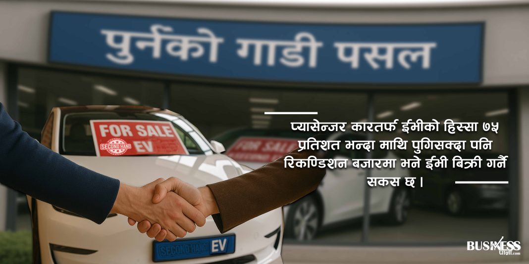 सेकेण्ड ह्याण्ड विद्युतीय गाडीहरुको मूल्य राम्रो नआउने र बिक्री गर्न पनि निकै सास्ती ब्यहोर्नुपर्ने रिकण्डिशन हाउसहरुले बताउँदै आएका छन् । नयाँ सवारी साधनको आयातमा प्यासेन्जर कारतर्फ ईभीको हिस्सा ७५ प्रतिशत भन्दा माथि पुगिसक्दा पनि रिकण्डिशन बजारमा भने ईभी बिक्री गर्नै सकस छ ।