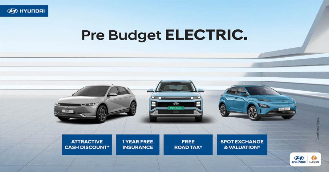 लक्ष्मी इन्टरकन्टिनेन्टलले हुण्डाईका तीन मोडेल इलेक्ट्रिक सवारीमा ‘प्रि–बजेट अफर’ ल्याएको छ । लक्ष्मी इन्टरकन्टिनेन्टलले जेठ ५ देखि १४ गतेसम्म सीमित अवधिका लागि लागू हुने गरी आकर्षक प्रि–बजेट अफर सार्वजनिक गरेको हो ।