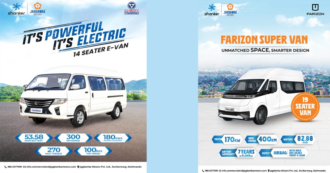 शंकर समूह अन्तर्गतको जगदम्बा मोटर्स प्रा.लि.ले विद्युतीय सवारी क्षेत्रमा आफ्नो उपस्थिति विस्तार गर्दै १४ देखि १९ सिट क्षमताका व्यावसायिक ईभी गाडीहरू सार्वजनिक गर्दैछ । यी गाडीहरू Farizon, Chery Wanda र King Long जस्ता चिनियाँ प्रख्यात ब्रान्डहरूमार्फत उपलब्ध गराइएका हुन् ।