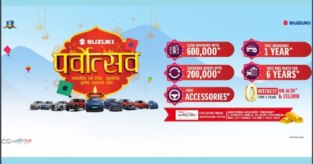 कम्पनीले दशैं–तिहारलाई लक्षित गर्दै ‘सुजुकी पर्वोत्सव अफर’ पनि ल्याएको छ । यस अफरअन्तर्गत ग्राहकले ६ लाख रुपैयाँसम्म नगद छुट पाउने छन् । साथै, एक वर्षसम्मको बीमा, छ वर्षसम्म निःशुल्क एच पार्ट्स, २ लाख रुपैयाँसम्मको एक्सचेन्ज बोनस पनि प्राप्त हुनेछ ।