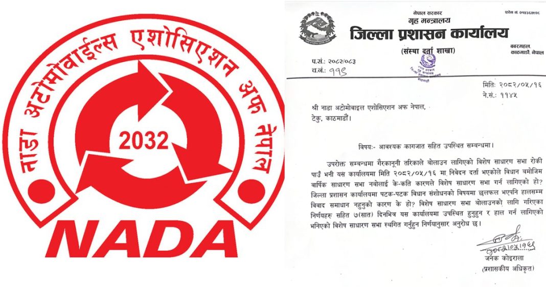 नाडा अटोमोबाइल्स एसोसिएसन अफ नेपालको विशेष साधारणसभा रोक्न स्थानीय प्रशासनले उर्दी जारी गरेको छ । भदौ २४ गतेका लागि डाकिएको विशेष साधारणसभा रोक्न जिल्ला प्रशासन कार्यालयले निर्देशन दिएपछि नाडाभित्र अन्योलको अवस्था सिर्जना भएको छ ।