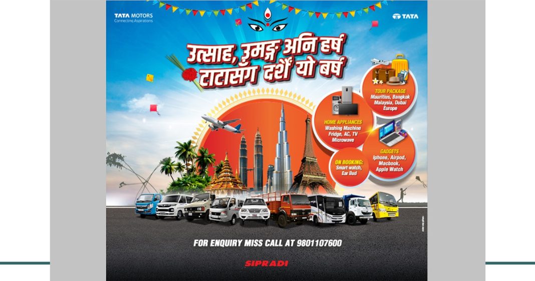 नेपालको लागि टाटा मोटर्सको आधिकारिक बिक्रेता सिप्रदी ट्रेडिङ प्रा.लि.ले यो वर्षको दशैँलाई लक्षित गरि विभिन्न अफर योजना सार्वजनिक गरेको छ । जस अन्तर्गत टाटाको प्रत्येक कमर्सियल गाडी खरिद गर्दा ग्राहकले होम अप्लायन्स, ग्याजेट वा टुर प्याकेजमध्ये एक रोजेर लिन सक्नेछन् ।