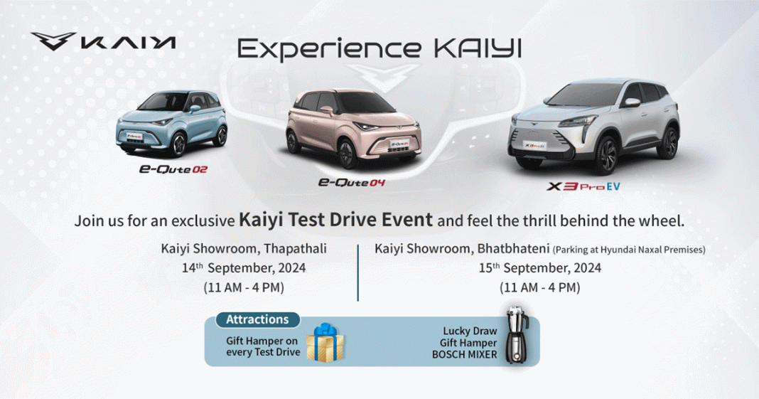 नेपालको लागि केई अटोमोबाइल्सको आधिकारिक विक्रेता लक्ष्मी ई मोबिलिटी ले ‘Experience Kaiyi’ टेष्ट ड्राइभ कार्यक्रम गर्ने भएको छ । भाद्र २९ गते केई शोरुम थापाथली र ३० गते केई शोरुम भाट-भटेनी नक्शालमा टेष्ट ड्राइभ कार्यक्रम गर्ने कम्पनीले जनाएको छ ।