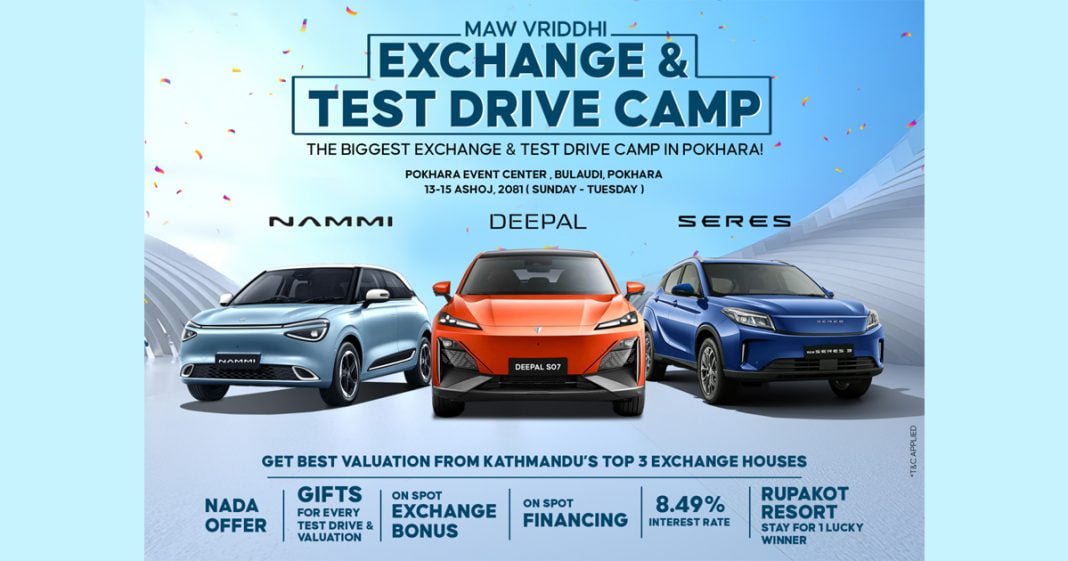 नेपालका लागि दीपल, सेरेस र नामी ब्राण्डका इलेक्ट्रीक भेहिकलको आधिकारिक वितरक एमएडब्लू वृद्धि अटोले पर्यटकीय शहर पोखरामा हालसम्मकै ठूलो ‘एक्सचेन्ज एण्ड टेस्ट ड्राइभ क्याम्प’ गर्ने भएको छ । एमएडब्लू वृद्धिले पोखरा इभेन्ट सेन्टरमा असोज १३ देखि १५ गतेसम्म ‘एक्सचेन्ज एन्ड टेस्ट ड्राइभ क्याम्प’ आयोजना गर्न लागेको हो ।