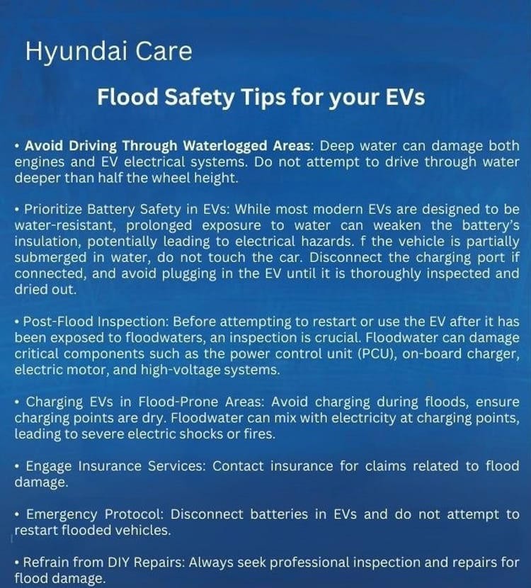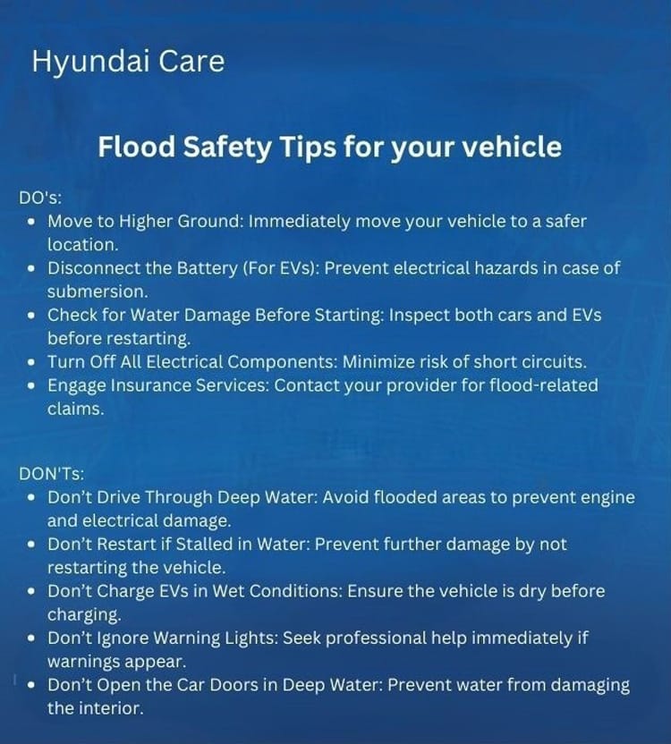 हुन्डाई केयरले सूचना जारी गर्दै कार पानीमा डुबेको अवस्थामा गाडीको प्रयोग गर्ने प्रयास नगर्न भनेको छ । पानीमा कार डुबेको अवस्थामा कम्पनीलाई जानकारी गराएर सम्बन्धित सर्भिस सेन्टरका मानिसमार्फत सर्भिस सेन्टर पठाउन अनुरोध गरेको छ ।