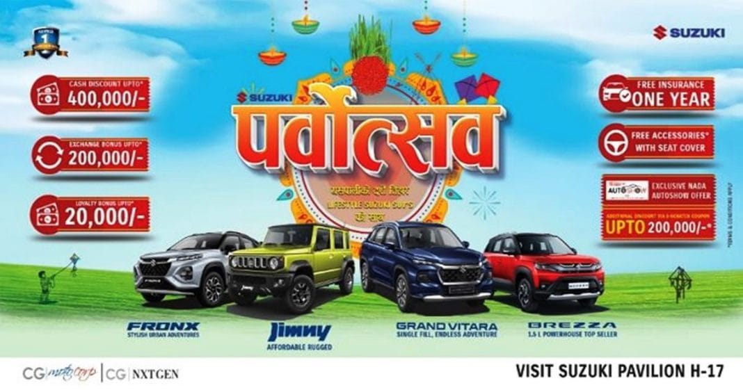 दशैँ, तिहारको अवसरमा सुजुकीको गाडी किन्दा ४ लाख रुपैयाँ नगद छुट पाइने अफर सार्वजनिक भएको छ । नेपालका लागि सुजुकीको आधिकारीक बिक्रेता सीजी मोटोकर्पले चाडपर्वलक्षित अफर सार्वजनिक गर्दै ४ लाख नगद छुट र निःशुल्क बीमा सुविधा दिने जनाएको छ ।