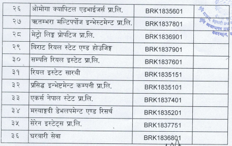 यस्तै, मालपोत कार्यालय कलंकी (काठमाडौँ), चाबहिल (काठमाडौँ), धरान (सुनसरी), सिमरा (बारा), हेटौँडा (मकवानपुर), भरतपुर (चितवन), चनौली (चितवन), पोखरा (कास्की), लेखनाथ (कास्की), तुल्सीपुर (दाङ) र बुटवल (रुपन्देही) मा हुने घर तथा जग्गाको लिखत पारित पनि अब कम्पनीबाट मात्रै गर्नुपर्नेछ ।