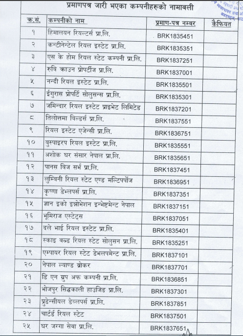 ३ करोड भन्दा माथिको वार्षिक कारोबार हुनेगरी घरजग्गा किनबेच गर्नेले अनिवार्य रुपमा इजाजत लिनुपर्ने प्रावधान कार्यान्वयन गर्न विभागले दरखास्त आह्वान गरेको थियो । विभागका अनुसार लाईसेन्सको लागि १९८ कम्पनीले आवेदन दिएका थिए ।