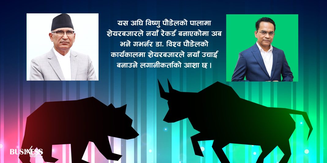अब केन्द्रीय बैंक अर्थात् नेपाल राष्ट्र बैंकको नेतृत्वमा अर्थशास्त्री डा. विश्वनाथ पौडेल आएका छन् । उनलाई सुरु देखि नै शेयर लगानीकर्ताले रुचाएका छन् । सत्तारुढ दलहरुबीच उनलाई गभर्नर बनाउने सहमति भएको समाचार बाहिरिएको दिन शेयरबजार ४९.०९ अंकले बढेको थियो । उनलाई गभर्नर नियुक्ति गरिएपछिको पहिलो दिनको शेयर कारोबारको प्रि ओपन सेसन मै नेप्से ३४.७९ अंकले बढेको थियो । यद्यपी अत्याधिक सेलीङ प्रेसरले बजारको त्यो गतिले निरन्तरता पाएन ।