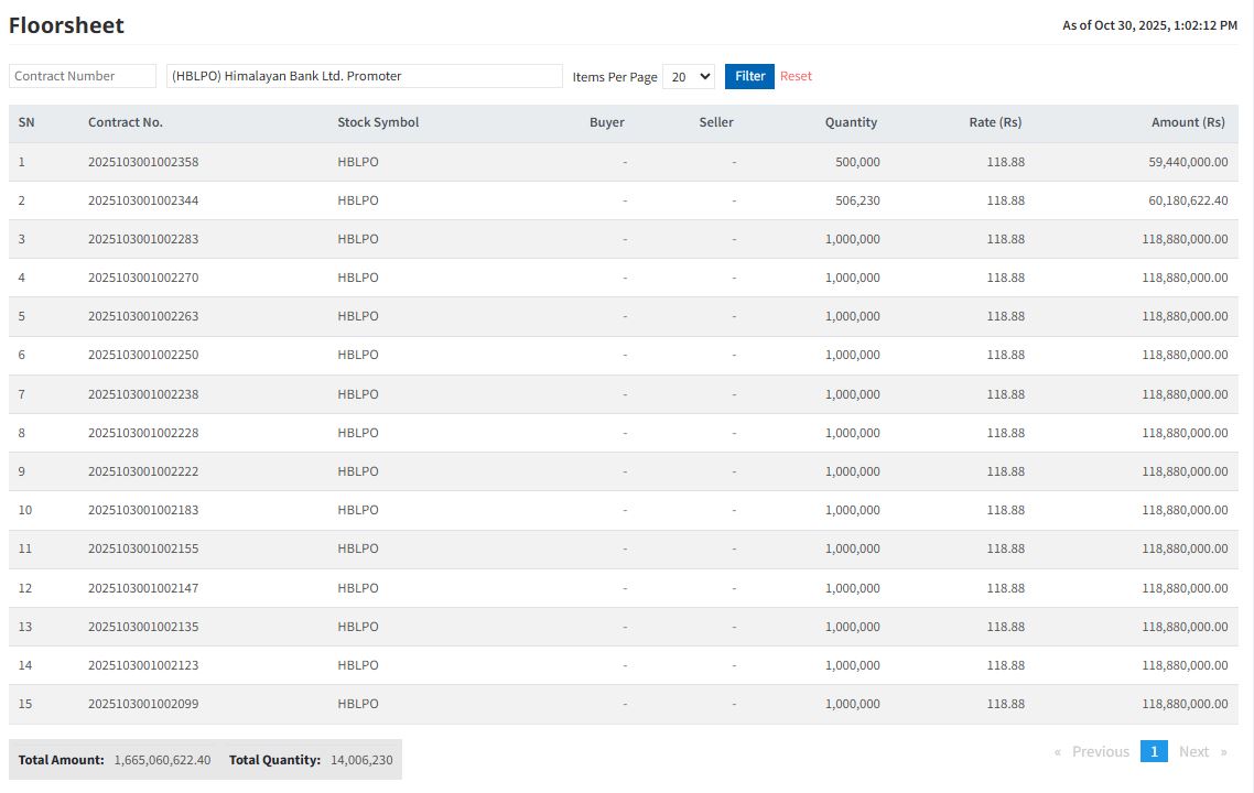 नेशनल लाइफले आज बिहीबार नेपाल स्टक एक्सचेन्ज नेप्सेको अनलाइन ट्रेडिङ सिस्टमबाट म्याचिङ कारोबार गरेर शेयर खरिद गर्न थालेको हो। यो समाचार तयार पार्दासम्म नेशनल लाइफले १ करोड ४० लाख ६ हजार २ सय ३० कित्ता शेयर खरिद गरिसकेको छ। प्रति कित्ता ११८.८८ को दरले शेयर कारोबार भएको छ। यसो हुँदा कुल १ अर्ब ६६ करोड ५० लाख ६० हजार ६ सय ६२ रुपैयाँ ४० पैसाको कारोबार भएको छ।