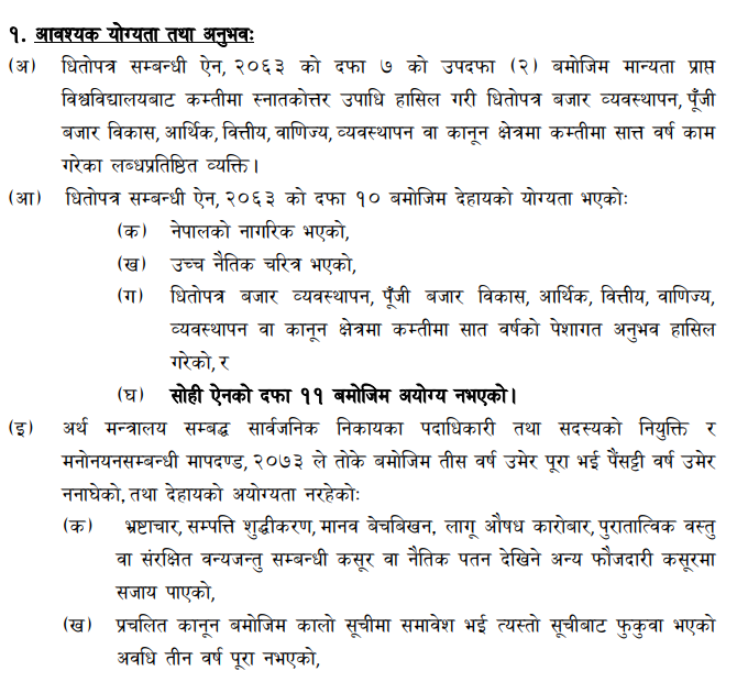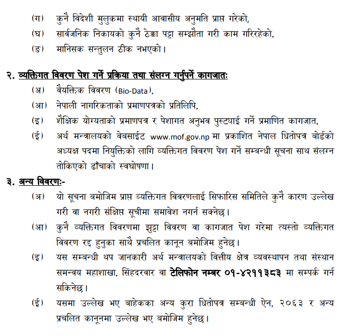 समितिले नेपाल धितोपत्र बोर्डको रिक्त अध्यक्ष पद पूर्तिको लागि नाम सिफारिस गर्नुपर्ने भएकोले ७ दिन भित्र अर्थात् वैशाख २१ भित्र योग्य तथा इच्छुकहरुलाई व्यक्तिगत विवरण पेश गर्न भनेको छ । अर्थ मन्त्रालयको वित्तीय क्षेत्र व्यवस्थापन तथा संस्थान समन्वय महाशाखा, सिंहदरवार, काठमाडौंमा अवस्थित समितिको सचिवालयमा व्यक्तिगत विवरण पेश गर्न भनिएको छ।
