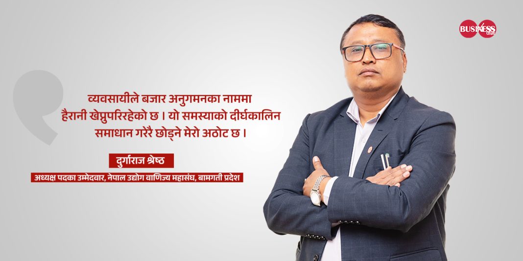 नेपाल उद्योग वाणिज्य महासंघ बागमती प्रदेशको अध्यक्षमा हालका उपाध्यक्ष दुर्गाराज श्रेष्ठले अध्यक्षमा उम्मेदवारी घोषणा गरेका छन् । नेपाल वितरक संघको पूर्व अध्यक्षसमेत रहेका श्रेष्ठ हाल नेपाल उद्योग वाणिज्य संघ काठमाडौँको महासचिवसमेत हुन् ।